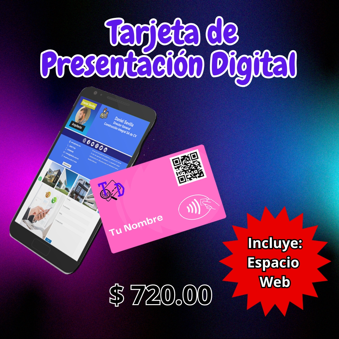 Tarjeta de Presentación digital. Incluye: Tarjeta de PVC personalizada y Espacio Web de una página, para publicar información de contacto, Redes Sociales, Productos y Servicios.